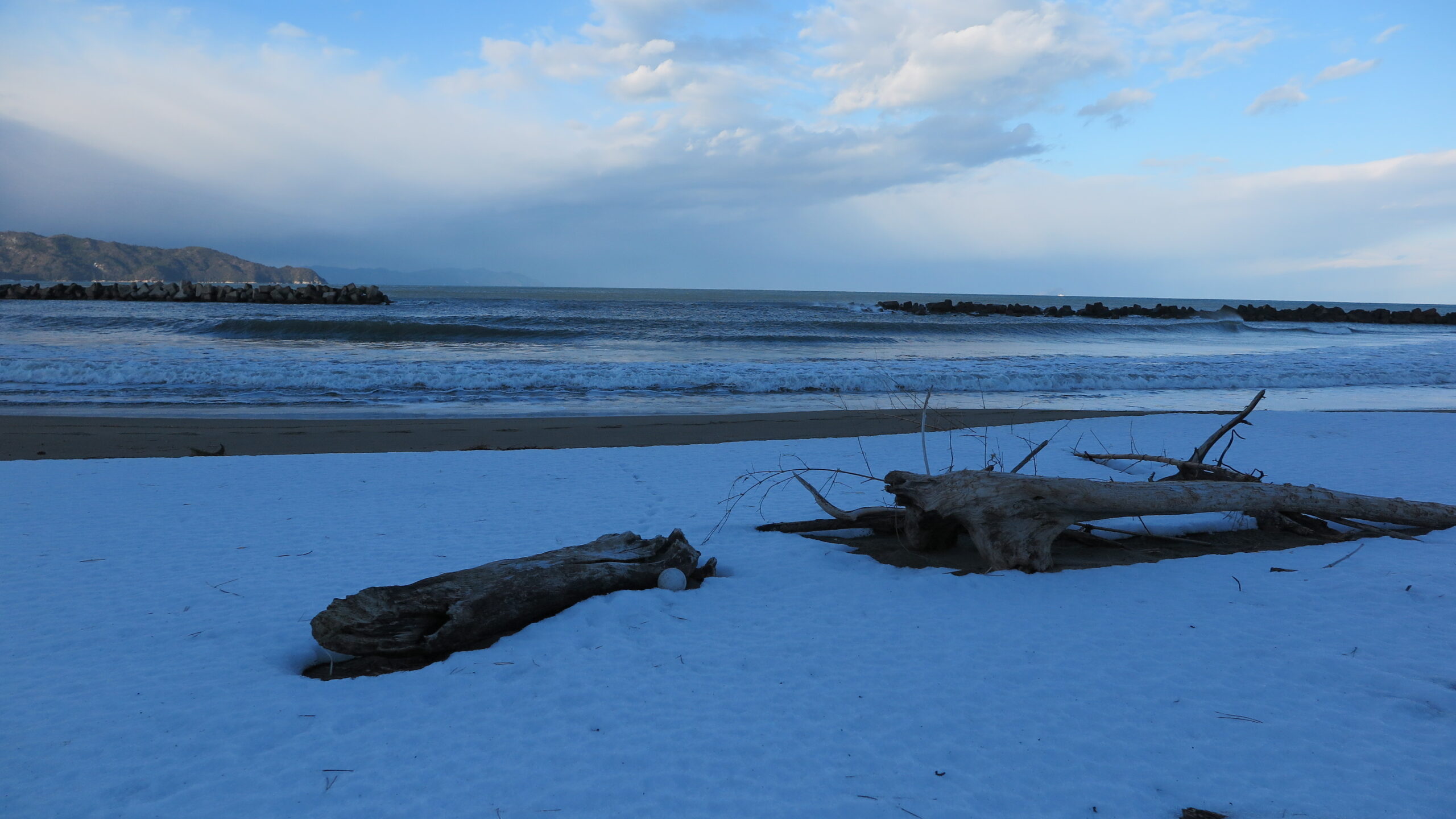 打ち寄せる白さの向こうで、消波ブロックが淡く光り、山の影が長く砂浜を包みこむ。