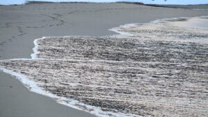 日が傾くと、海面の光は少し鈍り、砂の上を流れる泡の縁だけがかすかに明るい。
