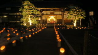 石段を照らすろうそくの炎と、境内に咲く和傘の彩り。静けさの中で揺れる灯りが、心をほどき、夜にやさしい余白を残してくれるお寺のライトアップの情景。
